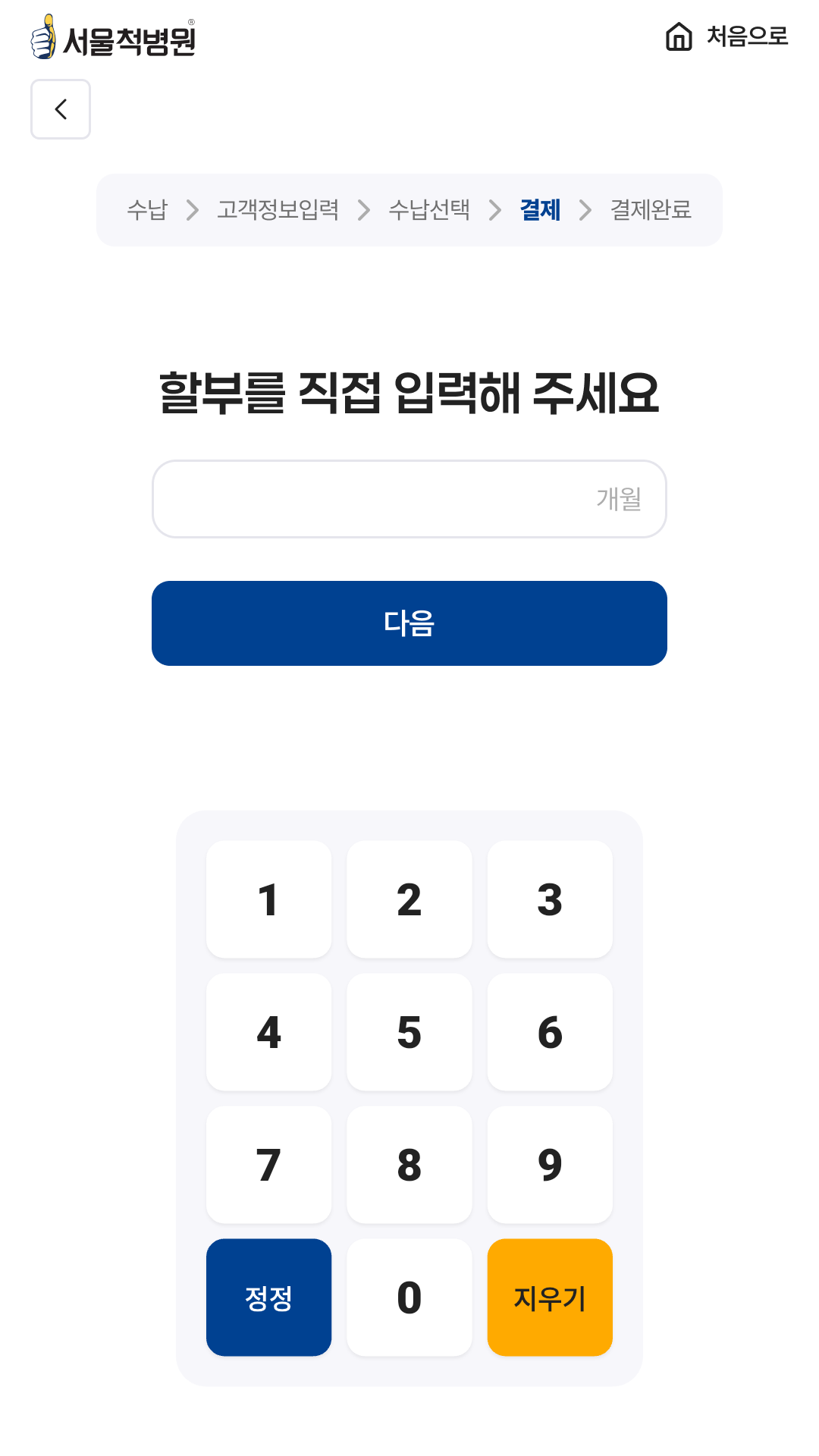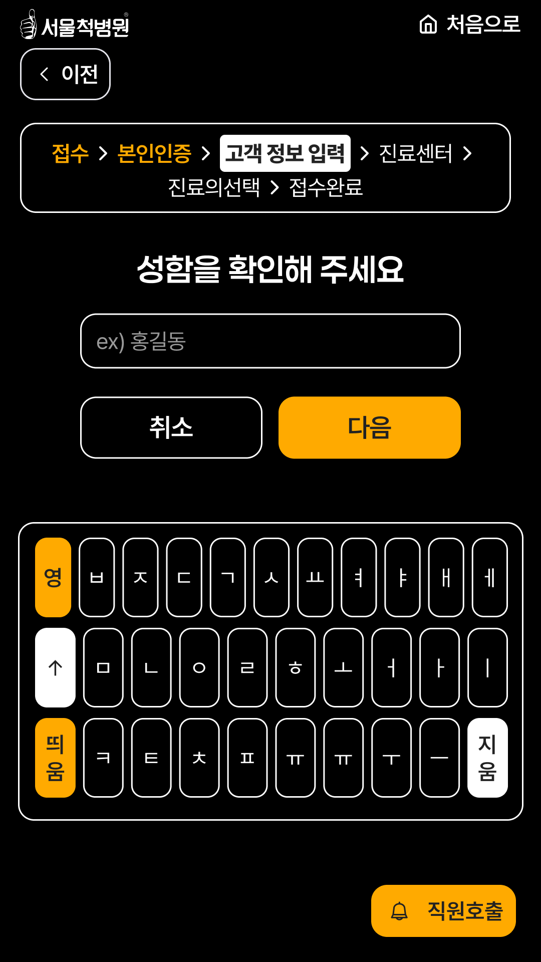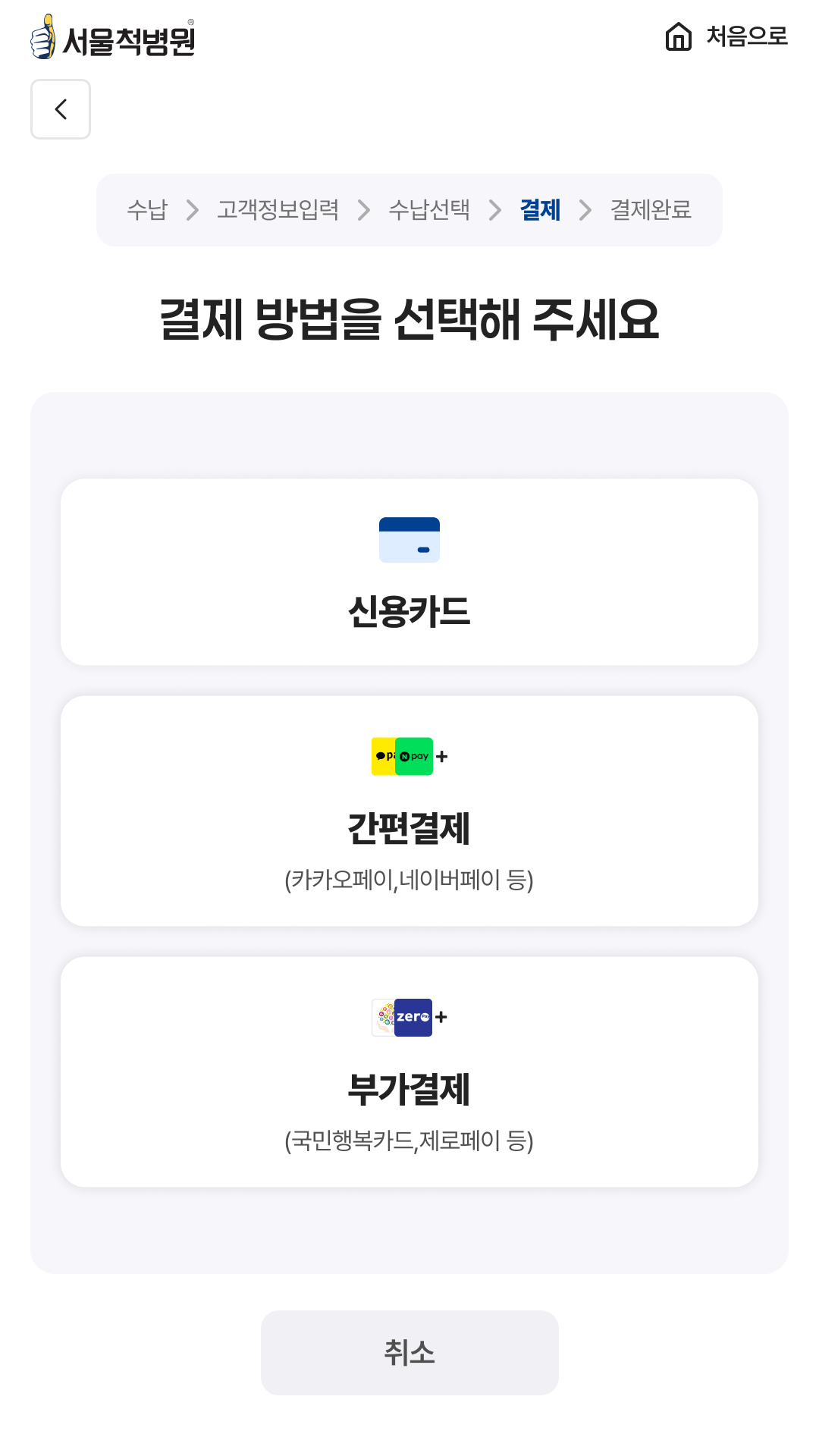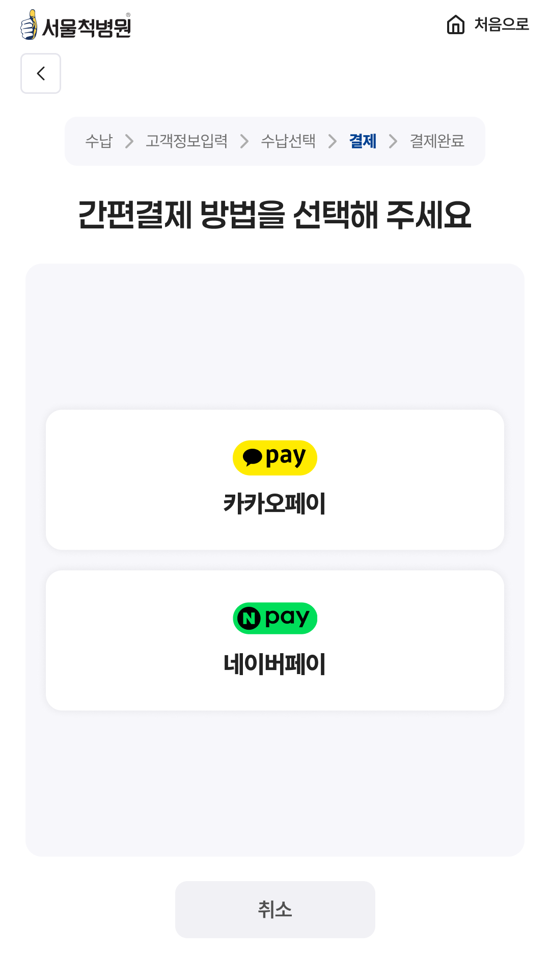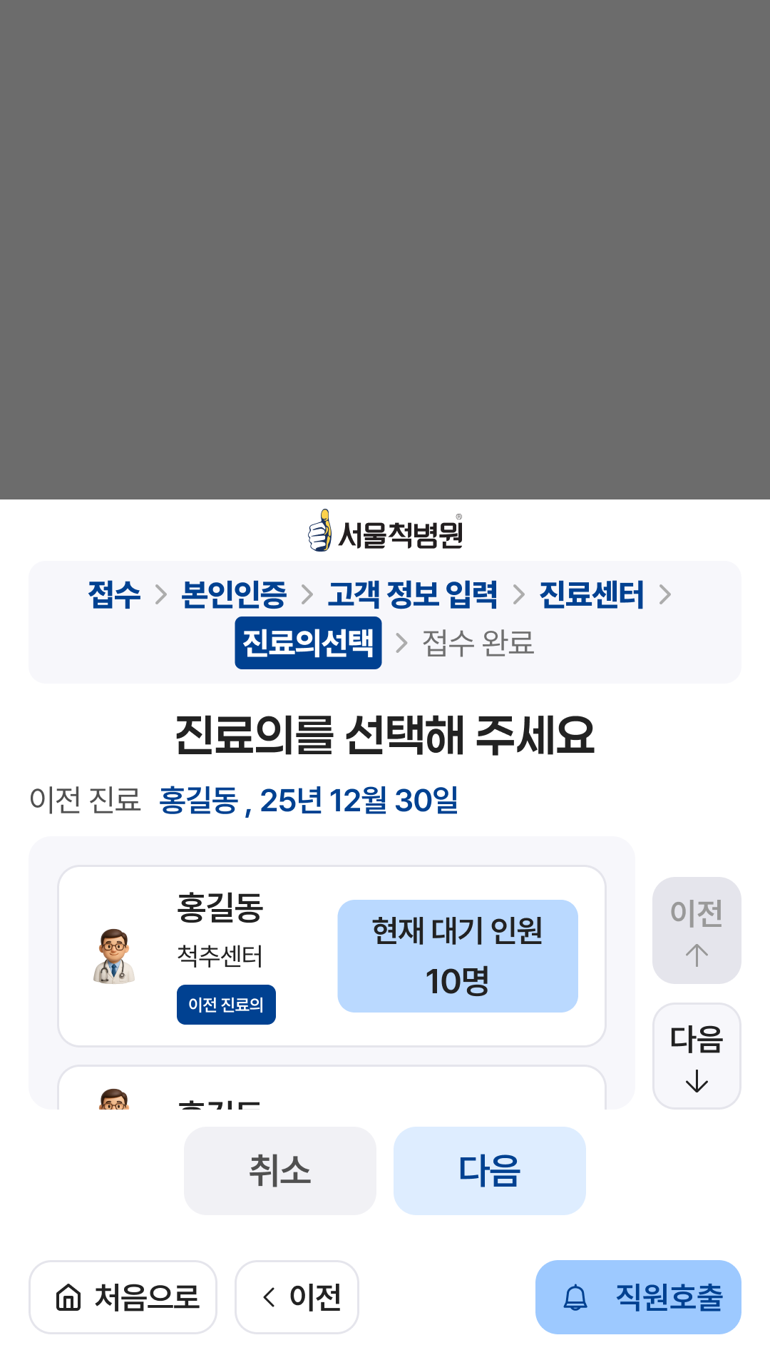 척병원 접수·수납 키오스크 UI 디자인입니다.