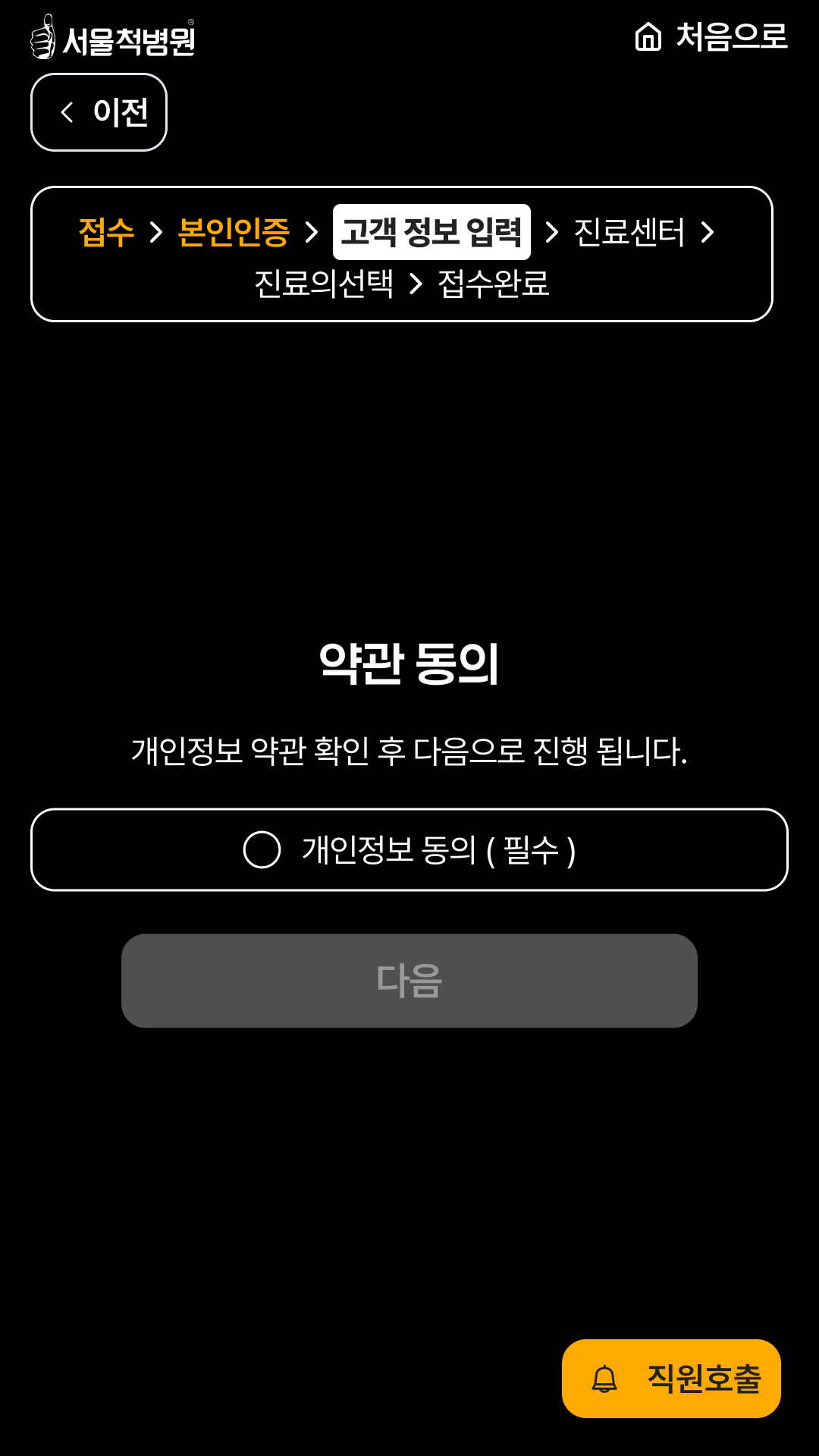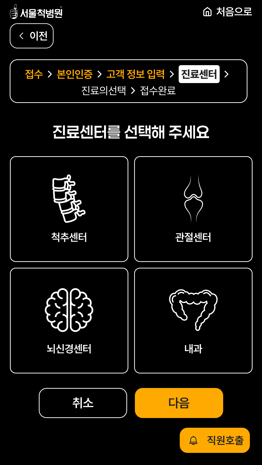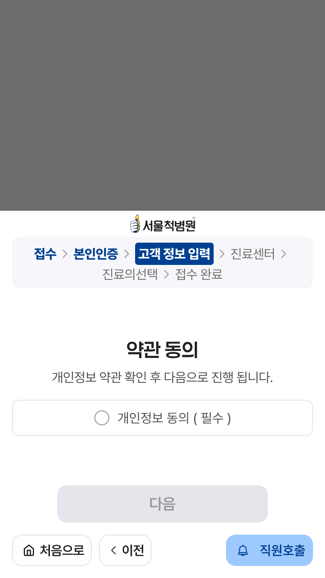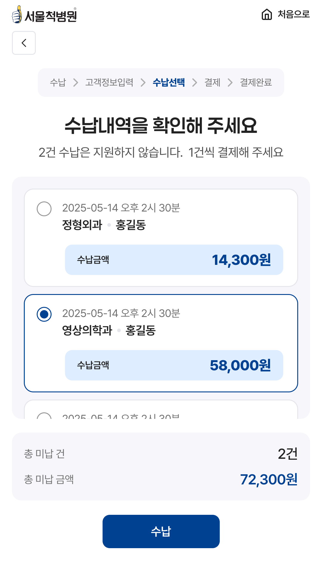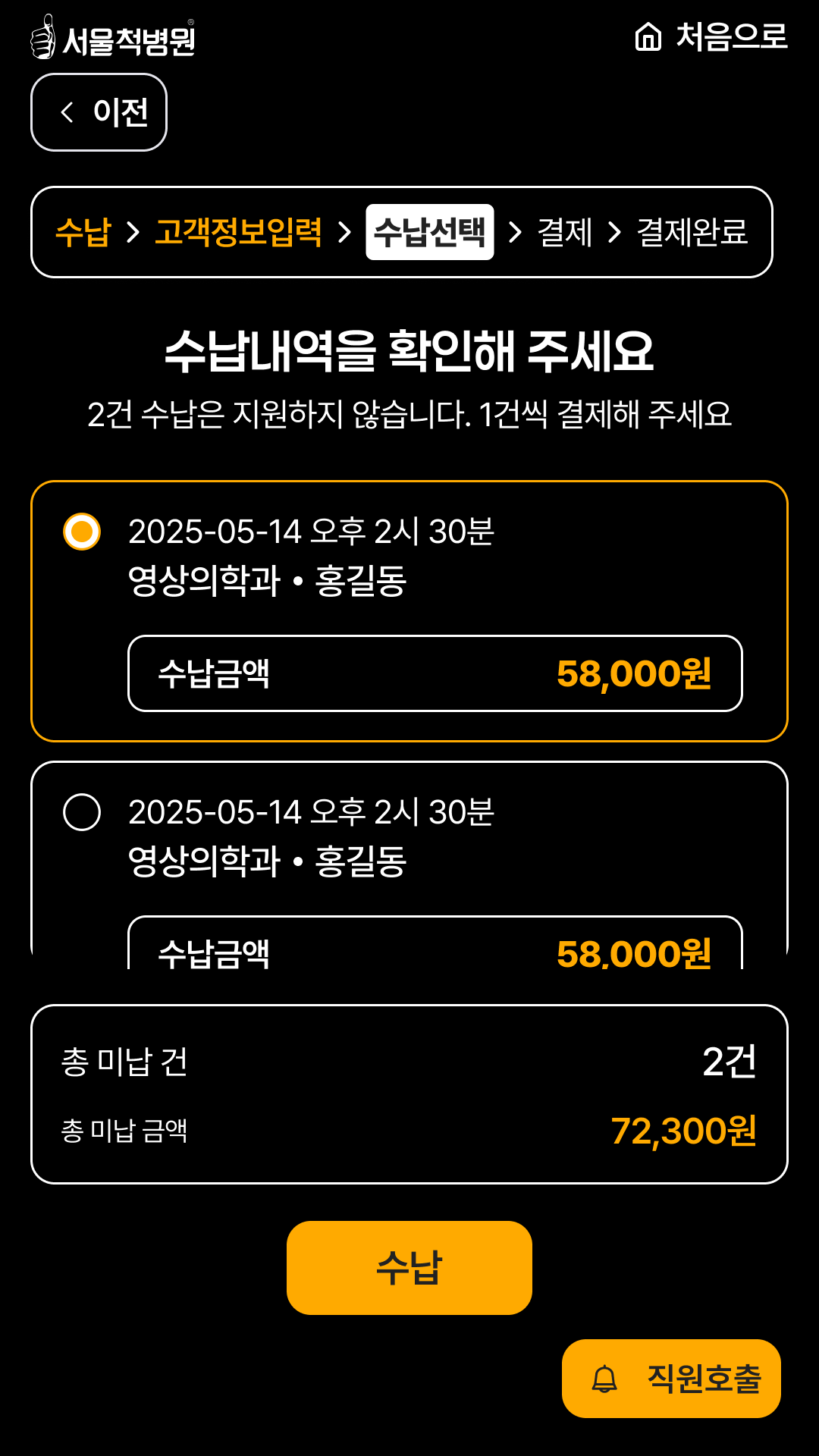척병원 접수·수납 키오스크 UI 디자인입니다.